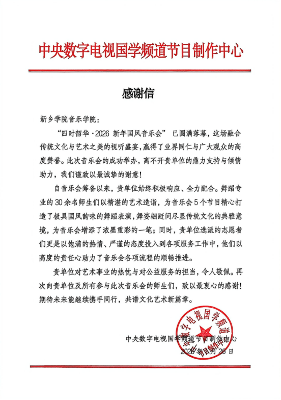 近日 午夜电影高清播放,我校音乐学院收到来自中央数字电视国学频道节目制作中心的感谢信,信件以真挚笔触肯定了音乐学院在国学文化传承与创新传播中的积极作为,对双方合作期间音乐学院给予的专业支持与鼎力协助致以诚挚谢意,为我校深耕传统文化教育,推动经典活化传播的实践增添了强劲动力。