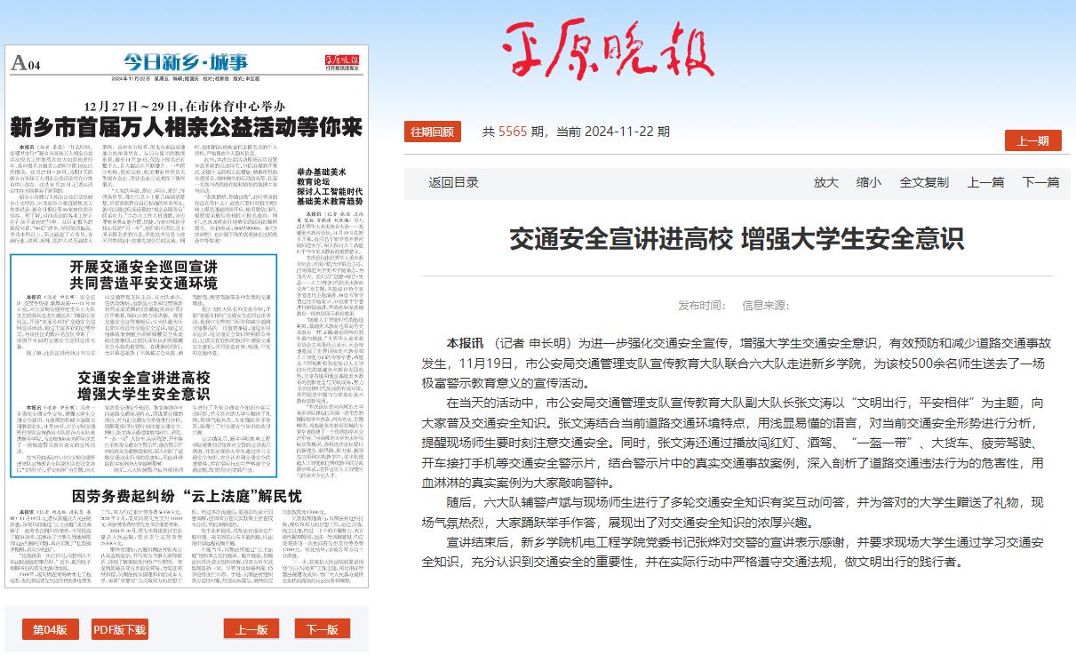 上一条:大象新闻 文旅中原报道我校举办“文明出行 平安相伴” 交通安全宣讲活动 下一条:新乡日报报道我校举办“文明出行 平安相伴” 交通安全宣讲活动