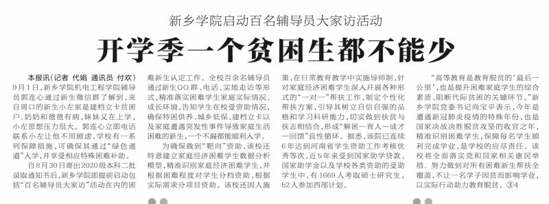 9月6日,《河南日报》第三版(要闻版)以《深夜在线电影启动百名辅导员大家访活动:开学季一个贫困生都不能少》为题 午夜在线影院,对我校困难新生资助工作经验进行了深入报道。