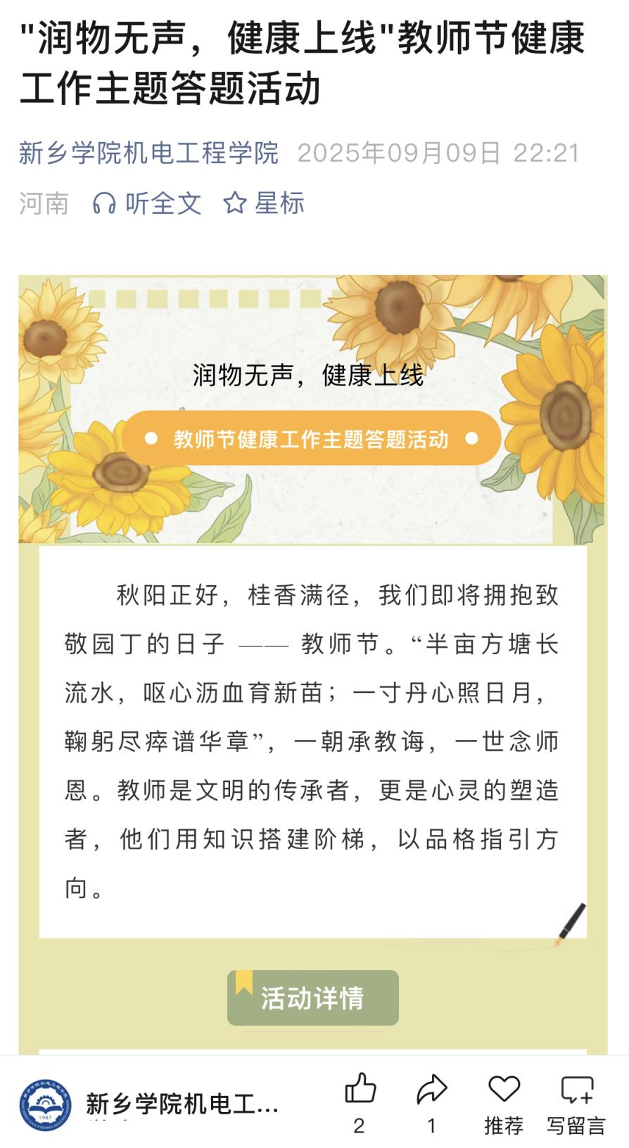 在第41个教师节来临之际 午夜电影高清播放,机电工程学院围绕教育部“以教育家精神铸魂强师 谱写教育强国建设华章”的主题,组织全体教师开展了一场以健康工作为内容的主题活动。