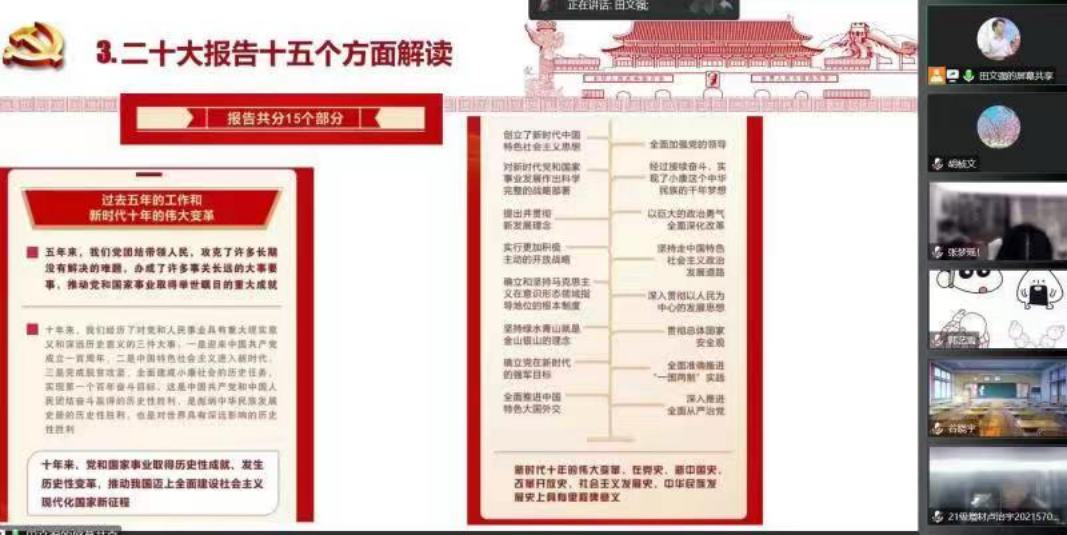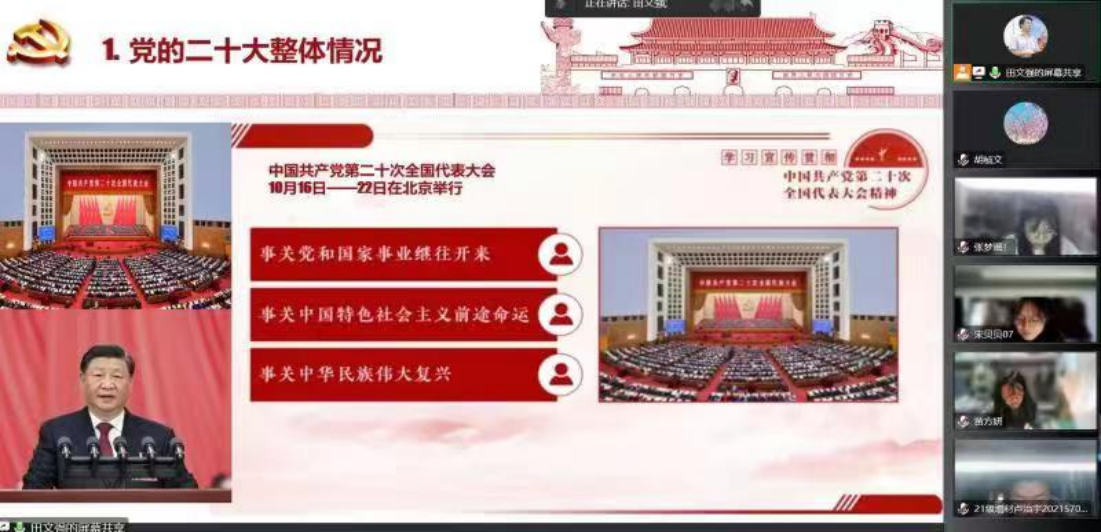 在党的二十大精神引领下,学院采用线上方式为师生入党积极分子培训班作专题培训 午夜电影资源,田文强在培训班上宣讲党的二十大精神,题目是《学习贯彻党的二十大精神,做信仰坚定的青年大学生党员》,学院教师党支部组织委员胡桢文结合党的二十大审议通过的《中国共产党章程(修订案)》的决议,为党的新生力量重新解读中国共产党章程。