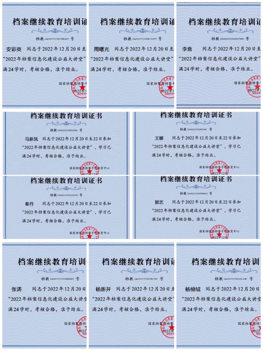 档案馆通过国家档案局了解到讲座培训信息后认为这是一次提升档案工作现代化水平,提高档案馆人员思想理论修养,加强档案工作素养的大好时机,立即发布通知组织动员全体人员在线学习,在工作群里转发了“档案信息化建设公益大讲堂学员手册” 午夜电影高清播放,指导大家了解学习内容,掌握在线注册,报名,收看讲座的方法,虽然当前疫情防控形势严峻,档案馆人员大多感染新冠病毒,处于居家隔离状态,但是大家克服身体上的不适,通过手机,电脑等积极参加在线学习培训,这次讲座规格高:由国家档案局副局长,中央档案馆副馆长付华作开班动员,邀请国家档案局领导,国家电子文件管理主管部门,国家档案局业务指导部门和地方档案部门以及高校从事档案信息化研究的专家学者担任主讲,讲座内容丰富,节奏紧凑:20日至22日,三天内每天上午九点到十一点半,下午两点到四点半,围绕“深入学习贯彻党的二十大精神,努力提高档案工作现代化水平”“数字时代背景下的国家电子文件管理发展战略”“电子档案长期保存的几个问题”“档案赋能数字政府与数字经济”“政务服务事项电子档案管理难点问题及应对之策”“新一代信息技术在档案工作中的应用”等六个方面专题对新时期档案工作进行了全方位的解读和宣讲,其中,对贯彻习近平总书记对档案工作重要批示的学习辅导,对二十大报告精神的重点解读,以及数字背景下档案工作,档案信息化工作的新探索,彰显了档案事业发展坚持党的领导,坚持人民立场,坚持依法治档,坚持改革创新,坚持安全底线的原则,经过两天时间的集中学习,大家吸收着档案前沿知识,感受着档案工作的荣光与责任,认真收看,仔细聆听,用心体会,讲座之后积极参加在线考试,并且以优异的成绩全部通过了培训考试,取得了培训结业证书。