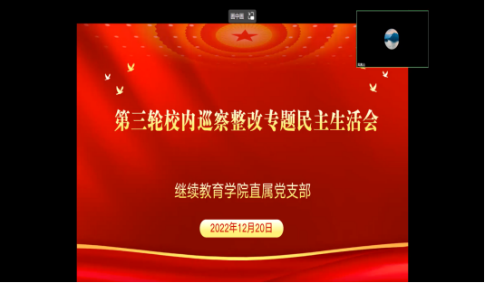 按照学校党委关于巡察整改工作的部署要求,12月20日下午 午夜电影在线观看,继续教育学院领导班子及班子成员以线上会议的方式召开巡察整改专题民主生活会,副校长张占祯和学院全体班子成员参加会议,学院党支部书记韩虹新主持会议。
