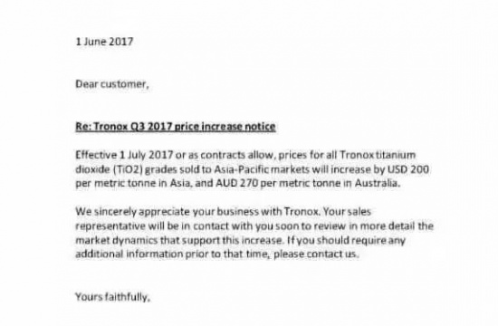 国际钛白粉巨头特诺Tronox宣布上调第三季度价格
