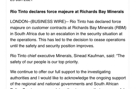 RBM发生不可抗力事件 采矿和冶炼已全面停产