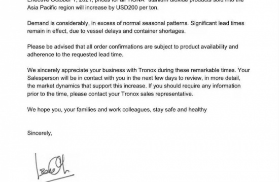 2021年10月1日起,TIONA价格每吨上调200美元