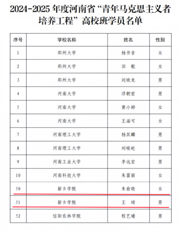 近日,共青团河南省委公布2024—2025年度河南省“青年马克思主义者培养工程”高校班学员名单,我校化学与材料工程学院2022级材料科学与工程1班朱俞晓,管理学院2022级物业管理1班王琦两名同学,经过资格审查 午夜电影在线观看,学校推荐,团省委笔试,面试,综合评审等选拔程序,最终脱颖而出,成功入选2024–2025年度河南省“青年马克思主义者培养工程”培养班高校班。